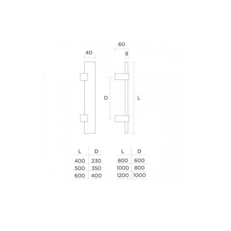Διάσταση:400mm,500mm,600mm,800mm, 1000mm και1200mm (μήκος λαβής) / 230mm,350mm,400mm,600mm, 800mm και 1000mm(κέντρα λαβής)
